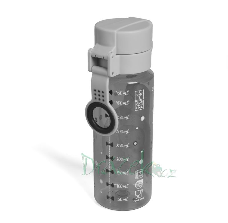 Precizně zpracovaná láhev na pití od výrobce Ars Una. Je vyrobena z kvalitního, nezávadného a zdraví neškodného materiálu. Neobsahuje žádné nebezpečné látky BPA. Láhev má odměrnou stupnici v ml je průhledná. Uzávěr je možné celý odšroubovat, uzavírání/otvírání funguje pomocí click systému - stlačení tlačítka. Zavírání má i pojistku, kterou není nutné používat, lahev drží zavřená i bez použití pojistky, ale při zavření na pojistku nemůže dojít k náhodnému otevření víčka.