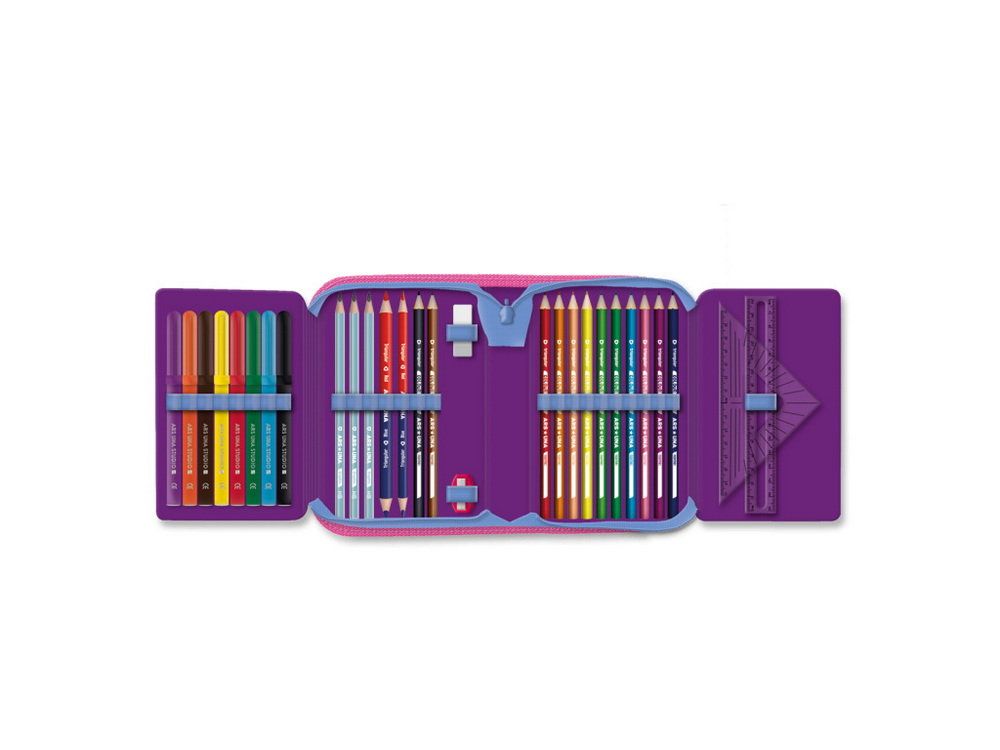 Součástí pouzdra je plná výbava složená z 10 barevných fixů, 3 tužek, 12 barevných pastelek, rovného 15 cm pravítka, trojúhelníkového pravítka, mazací gumy, ořezávátka a dvou rozvrhů hodin (názvy dnů jsou v maďarském jazyce) vložených v průhledné přihrádce. Všechny psací potřeby a školní pomůcky jsou přichyceny pomocí pružné gumičky.