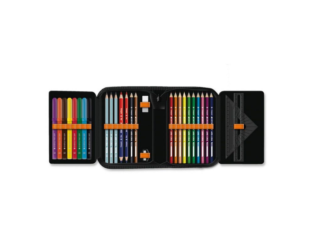 Součástí pouzdra je plná výbava složená z 10 barevných fixů, 3 HB tužek, 12 barevných pastelek, rovného 15 cm pravítka, trojúhelníkového pravítka, mazací gumy, ořezávátka a dvou rozvrhů hodin (názvy dnů jsou v maďarském jazyce) vložených v průhledné přihrádce. Všechny psací potřeby a školní pomůcky jsou přichyceny pomocí pružné gumičky.
