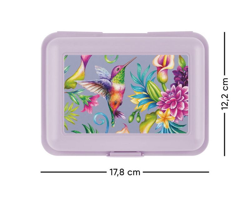 Plastový box na svačinu s nádherně barevným motivem květin a kolibříků rozjasní a rozveselí každou velkou přestávku.