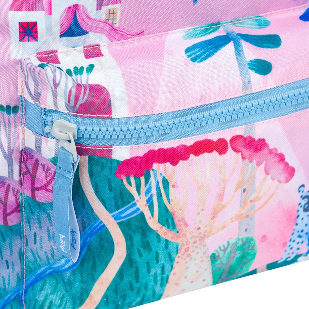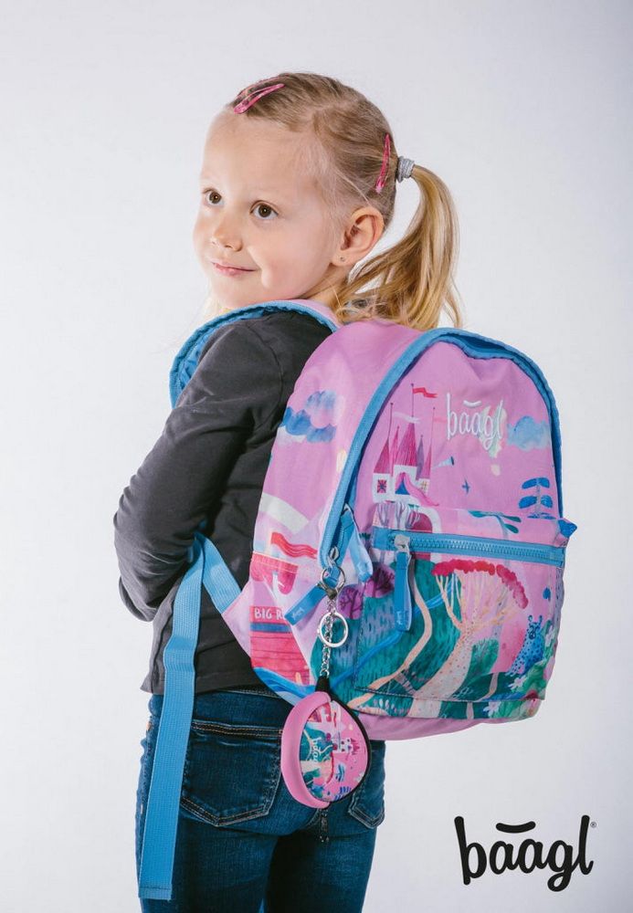 Růžový batůžek s potiskem pohádkové kulisy pojme svačinu, pití i pláštěnku, vše, co malá pricenzna potřebuje na výlet do pohádky.