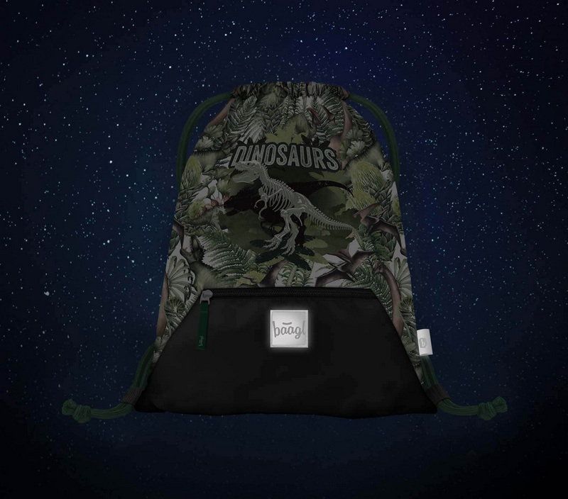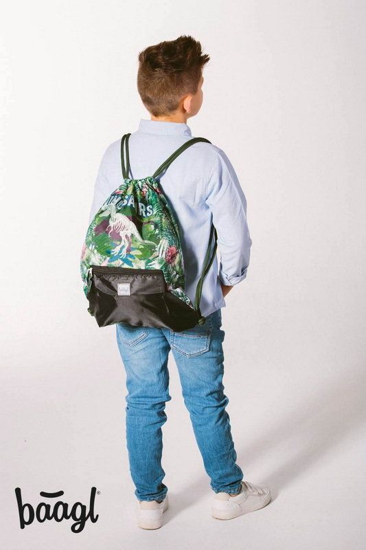Sáček na obuv nebo na tělocvik Dinosaurus je vyroben z pevného voděodolného materiálu se silnými šňůrami pro pohodlné nošení na zádech.