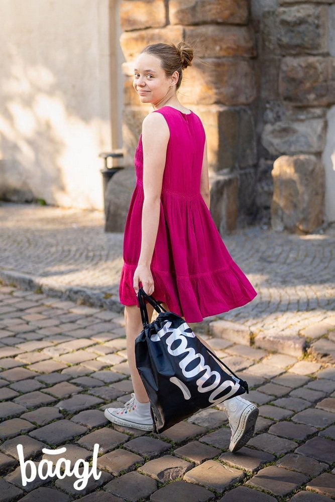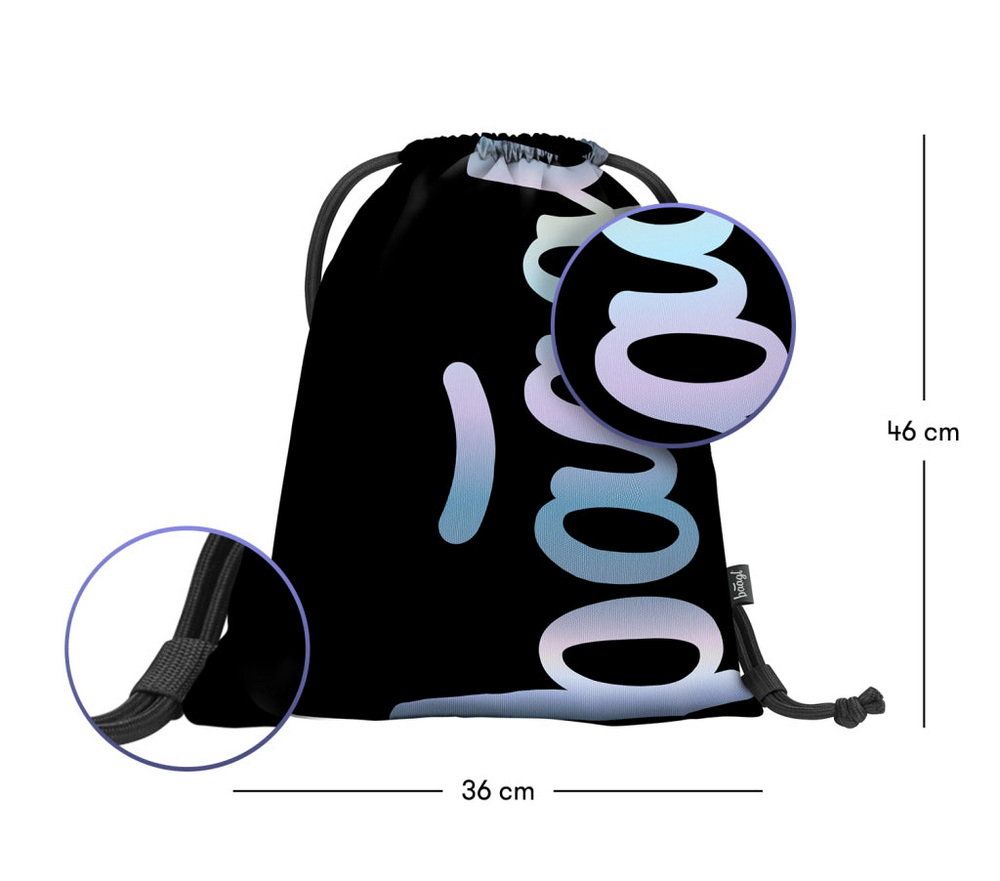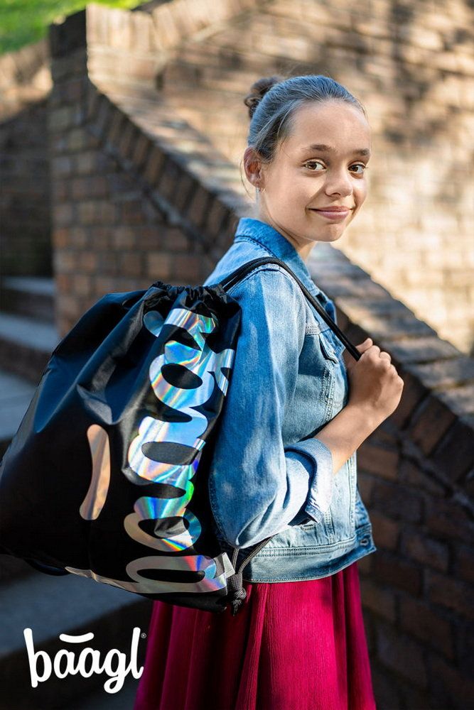Minimalistický design kombinující perleťově lesklé logo BAAGL s černým podkladem, na gymsacku, sáčku na tělocvik.