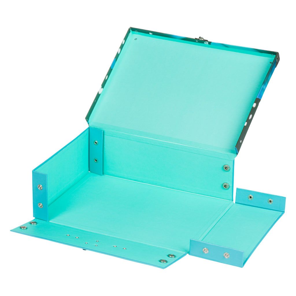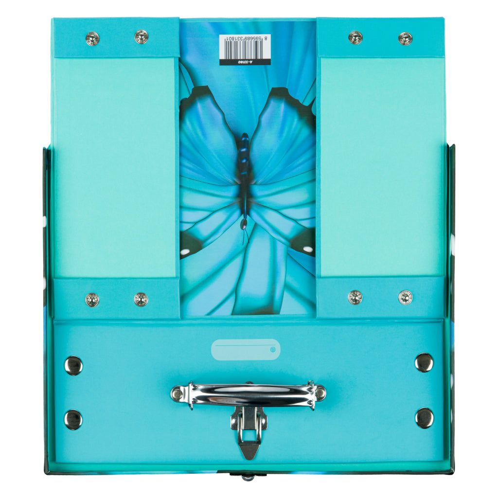 Papírový znovu rozkládací kufřík s jednoduchým systémem skládání pomocí patentků a designem motýlka v tyrkysových barvách.