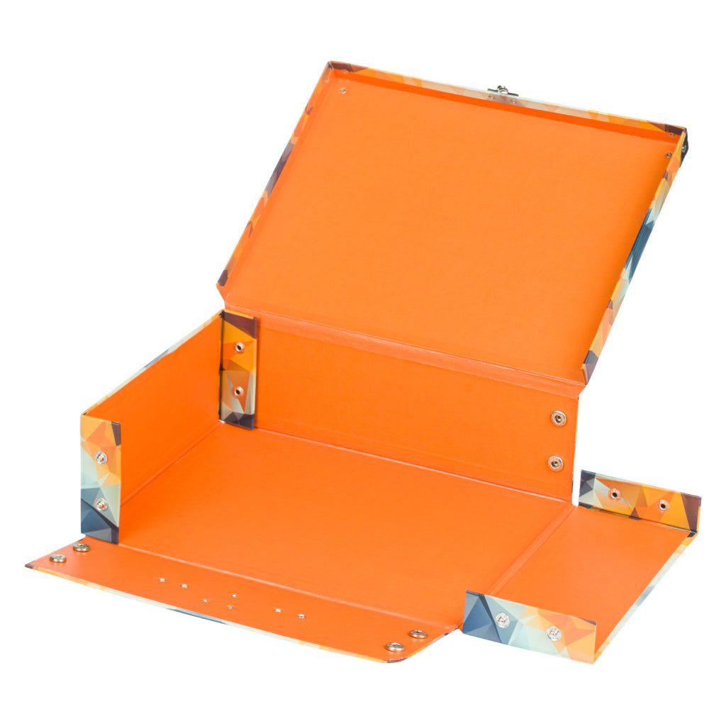 • Skládací kufřík z pevného laminovaného papíru s okovanými rohy.