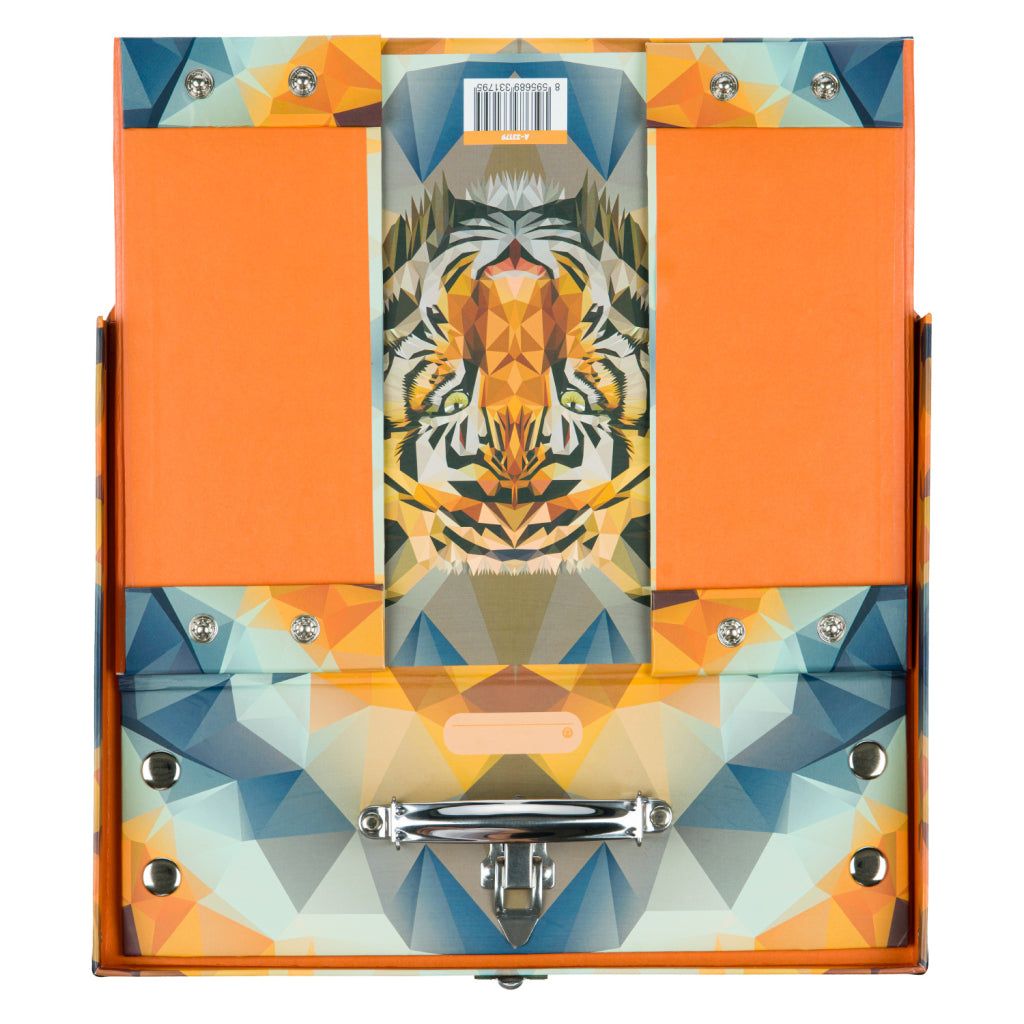 Papírový znovu rozkládací kufřík s designem divokého tygra na moderním abstraktním pozadí. Jednoduchý systém skládání pomocí patentků.