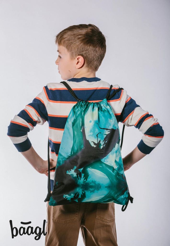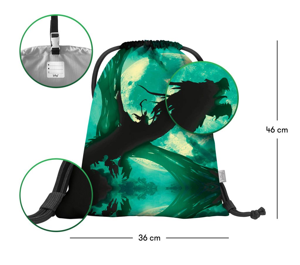Školní sáček na cvičky s motivem draka, laděný do odstínů zelené, je vyrobený z pevného voděodolného materiálu a má silné šňůrky pro pohodlné nošení na zádech.
