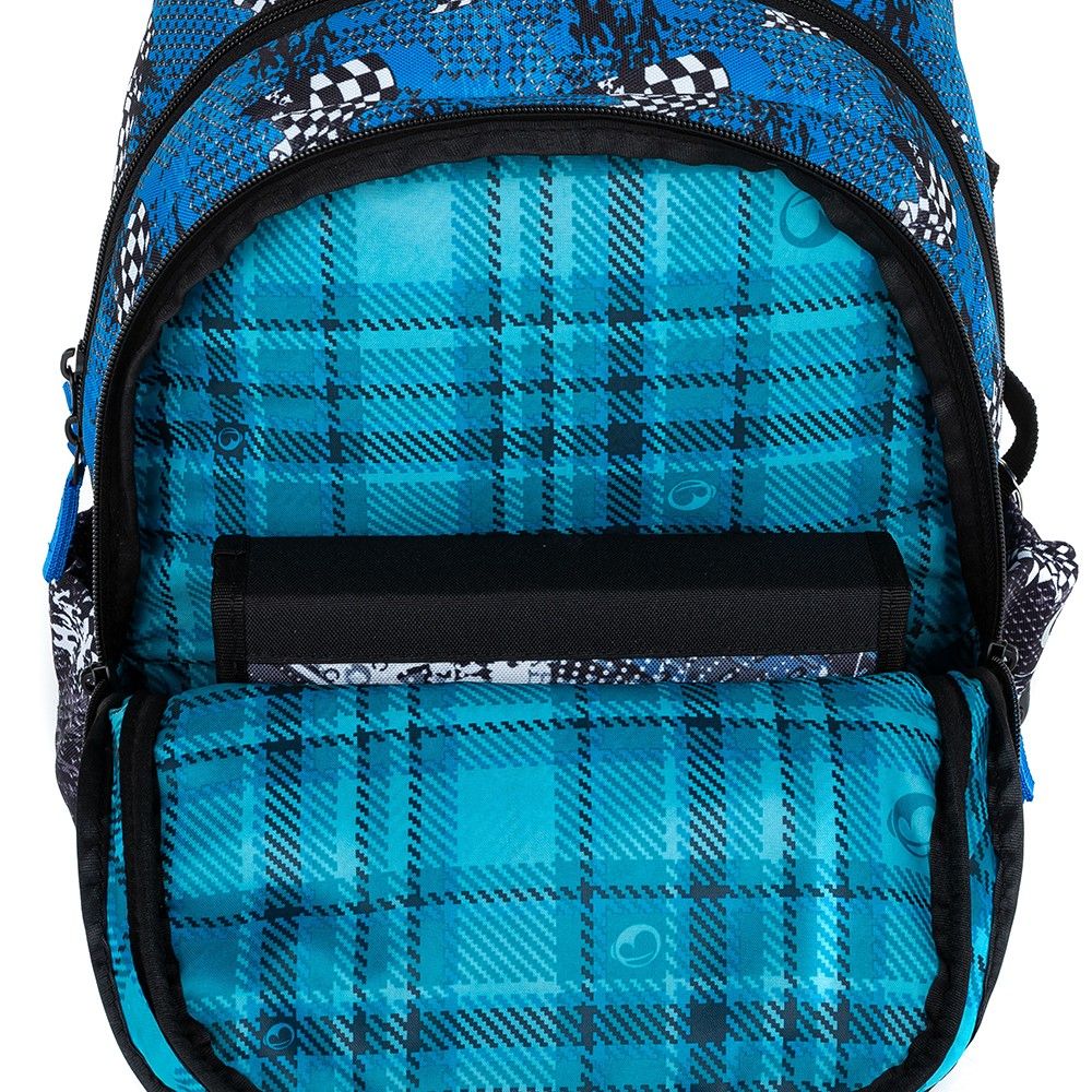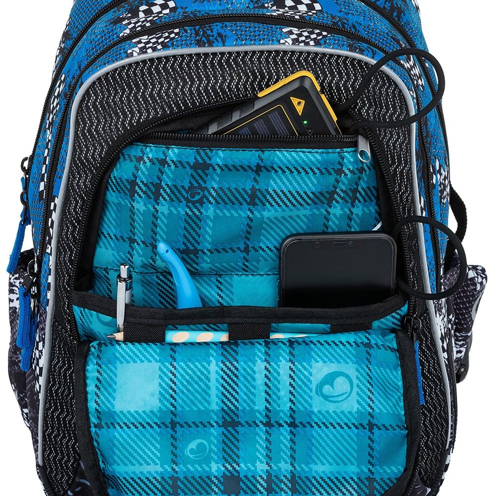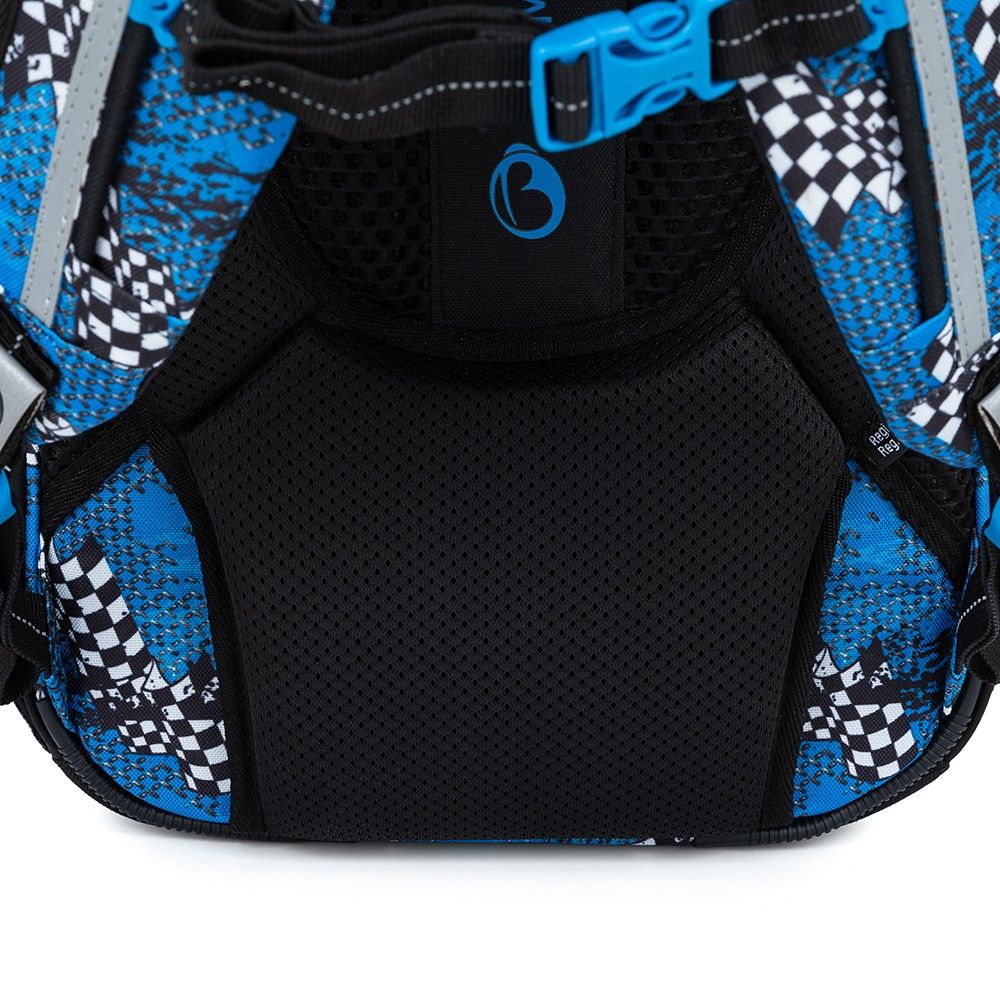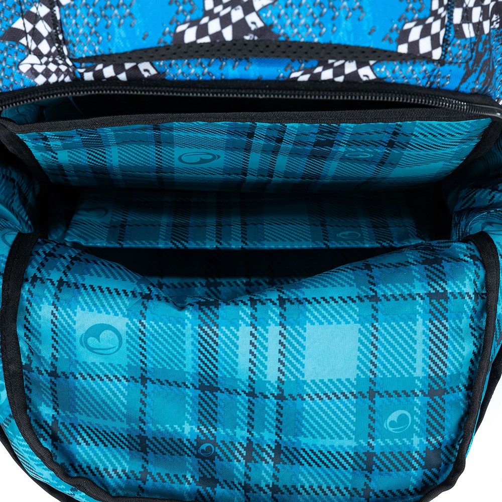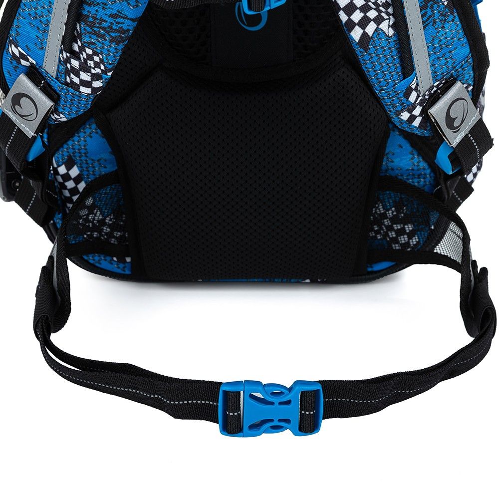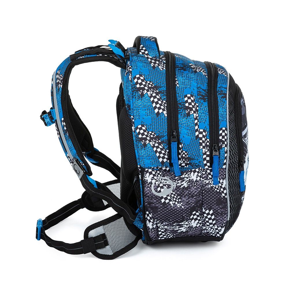 Tříkomorový školní superbatoh pro prvňáčky, kteří mají rádi auta a modrou barvu. Váží necelý kilogram, má nový bezpečný zádový systém s bederním pásem, reflexní prvky, praktický organizér i boční kapsu na pití. Síťovina na anatomicky tvarovaných popruzích a zádové části je měkká a neškrábe.