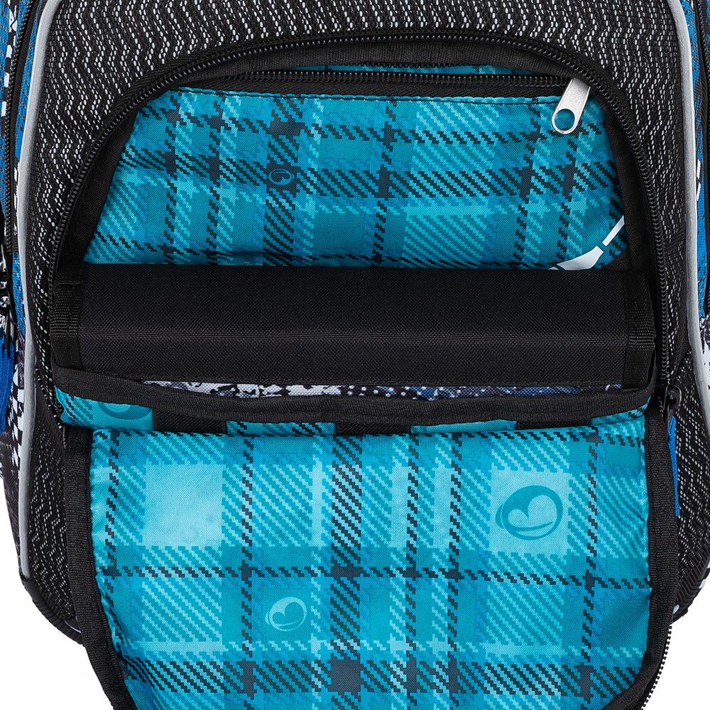 Má tři prostorné komory. Do hlavní se vejdou velké školní desky i učebnice a sešity formátu A4. V hlavní komoře je taky kompresní kapsa s elastickými postranními pásy na desky A4 a na velké učebnice. Pomáhá přitáhnout a udržet těžké pomůcky co nejvíce u zad, díky tomu má školák či školačka těžiště blízko páteře a při chůzi se nehrbí.