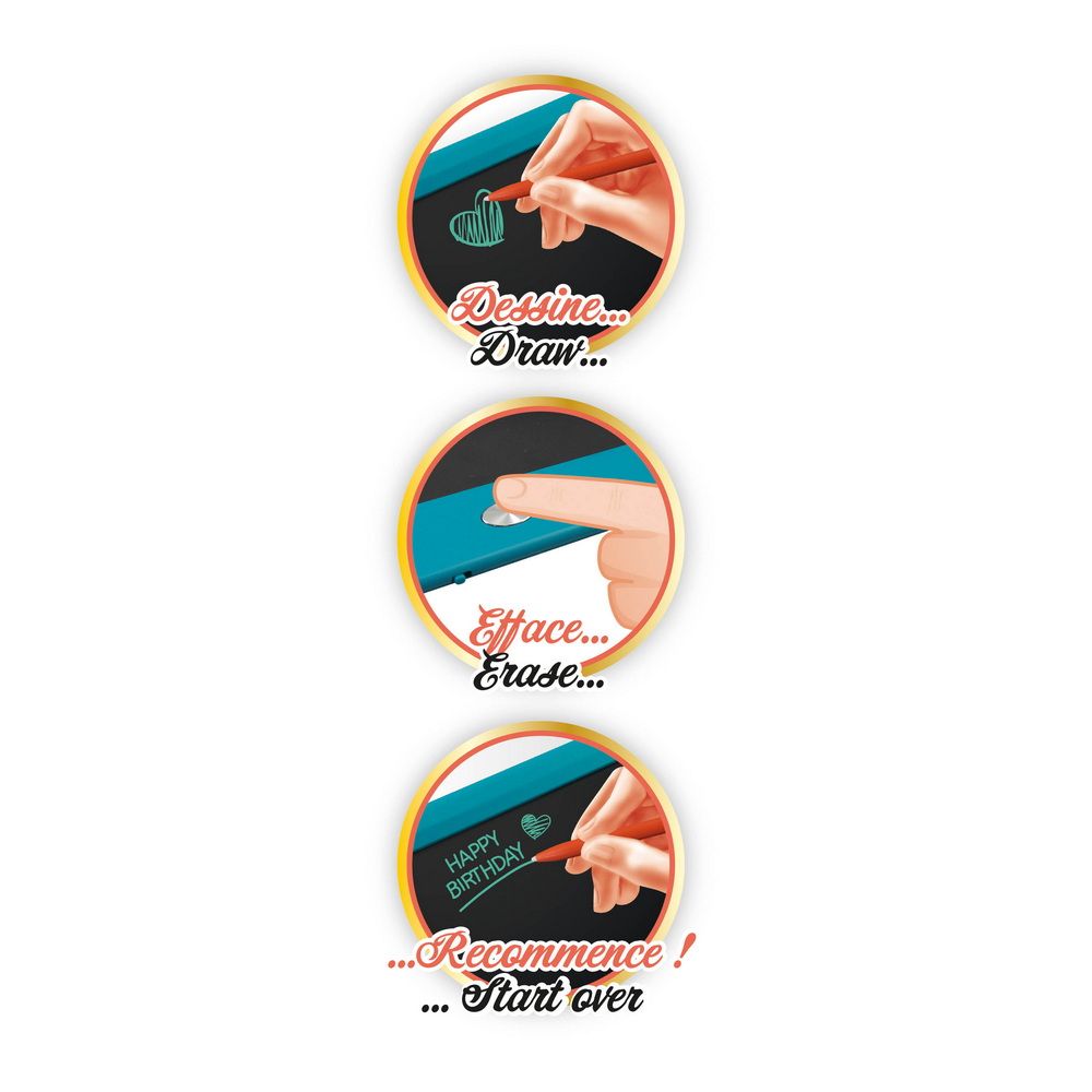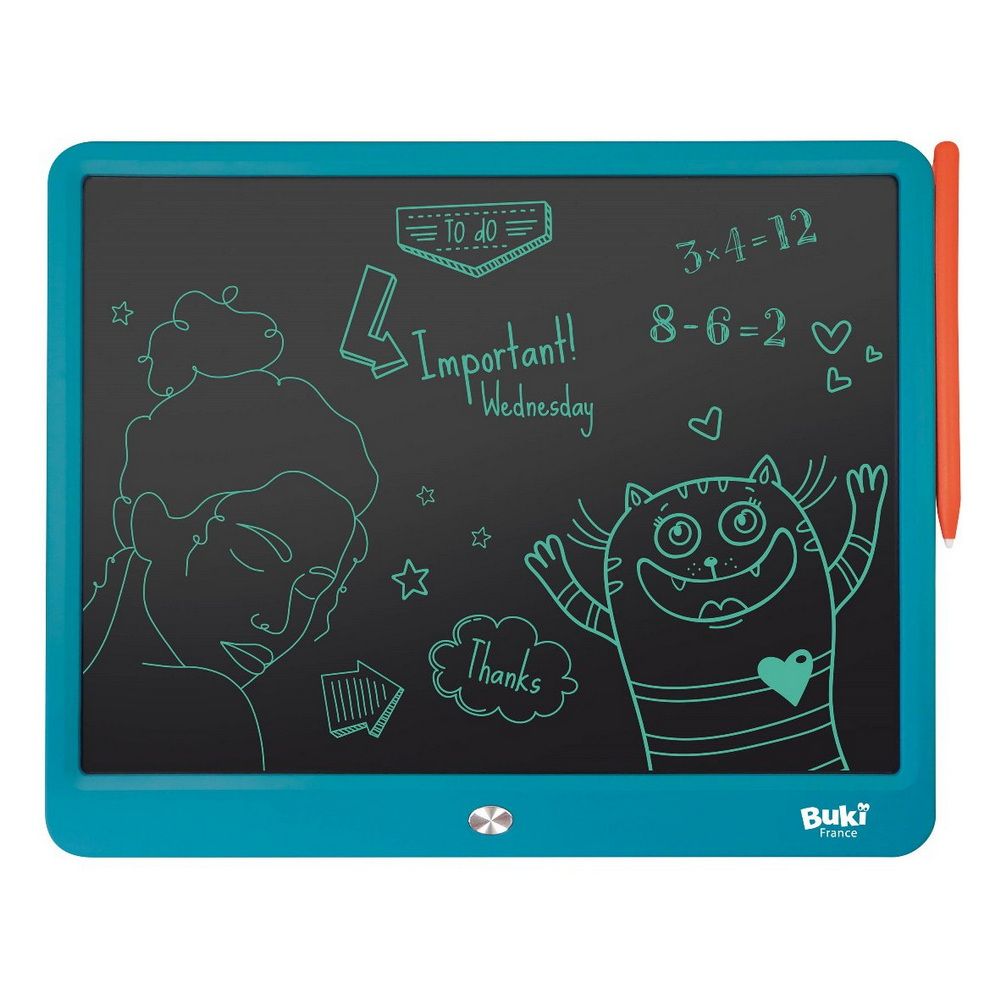 Jedinečný nástroj pro tvorbu poznámek, nákresů, vzkazů a jiné kreativní tvorby. Elektronický tablet s dotykovým perem umožňuje kreslení jednou barvou (tyrkysová - zelenomodrá) a následně můžete celou plochu vymazat jedním stiskem tlačítka. Tablet má úctyhodné rozměry 32x25,8cm a obrazovka reaguje i na sílu tlaku pera, takže je možné realizovat i složitější obrazce... fantazii se meze nekladou.
