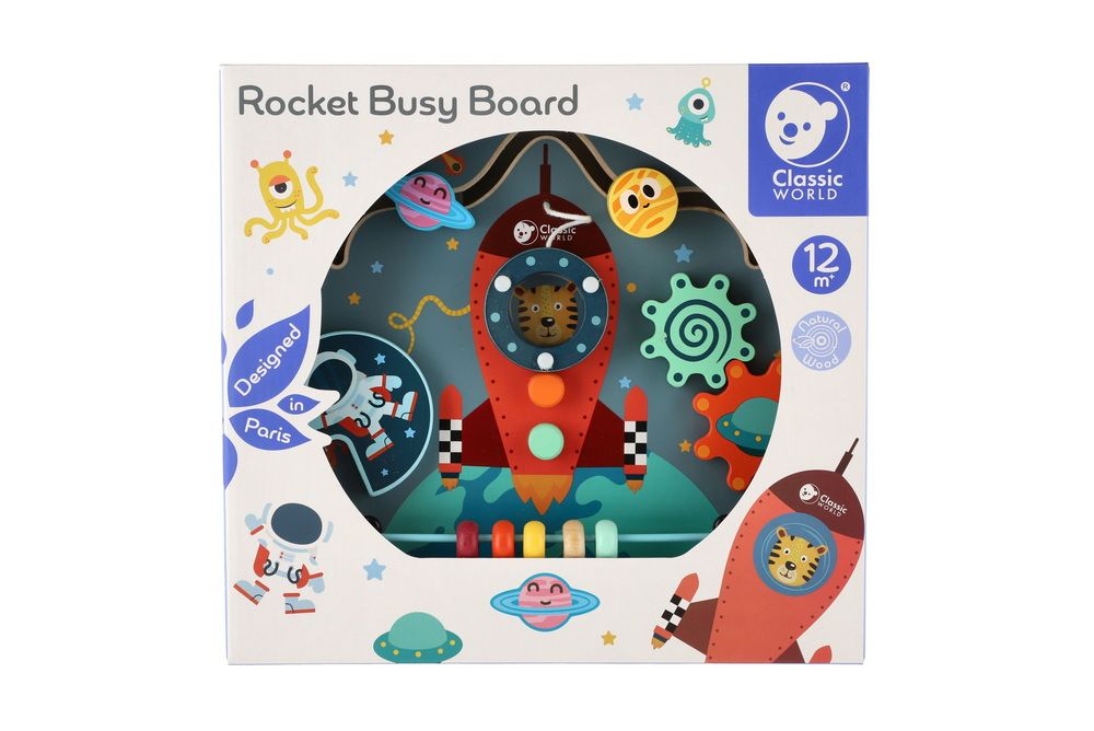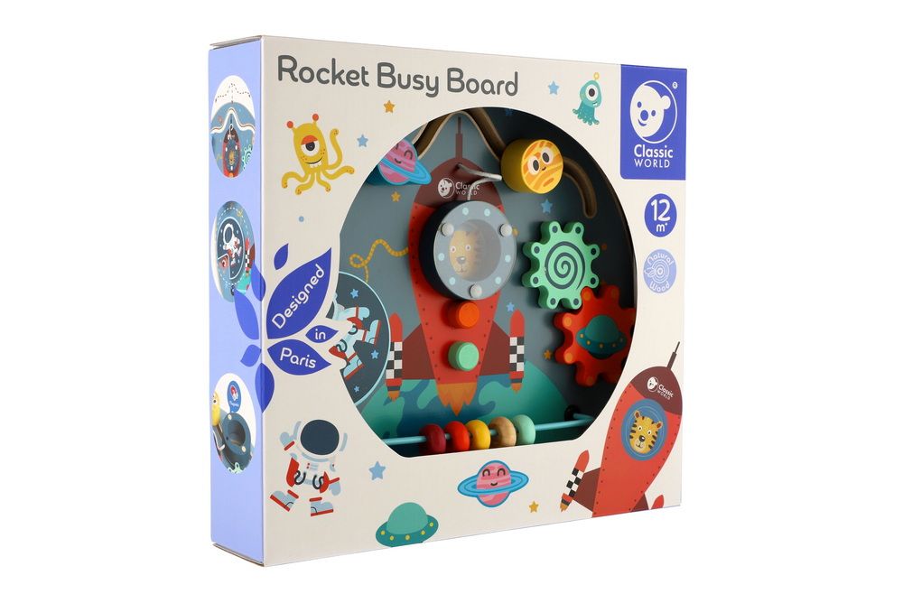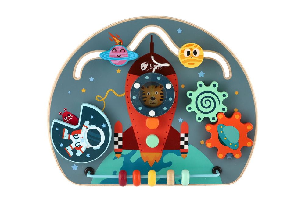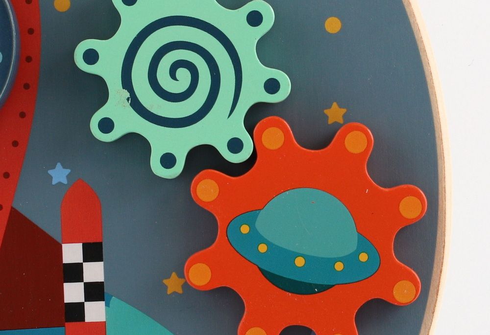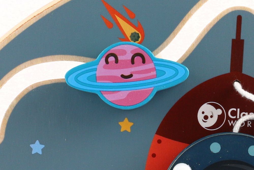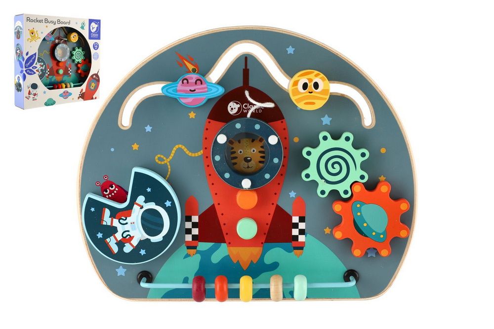 Dřevěný edukační labyrint s vesmírnou tématikou obsahuje herní funkce - bludiště, otočné bloky, ozubená kola a korálky.