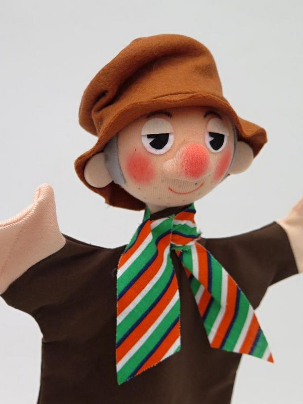 Textilní maňásek. Postava ševce typická pro francouzské loutkové divadlo.