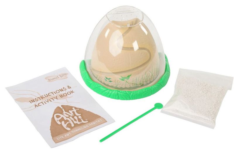 Nově navržené mraveniště nabízí hravou, barevnou krajinu, kde na její zadní straně můžete pozorovat chování mravenců při hloubení tunelů, komor a skrýší ve speciálním písku. Mravence si bezpečným postupem nasbíráte v přírodě a pak už jen sledujete život, který je lidským očím běžně ukrytý.