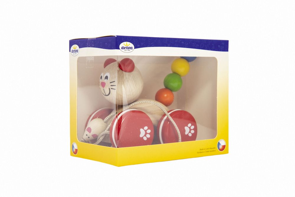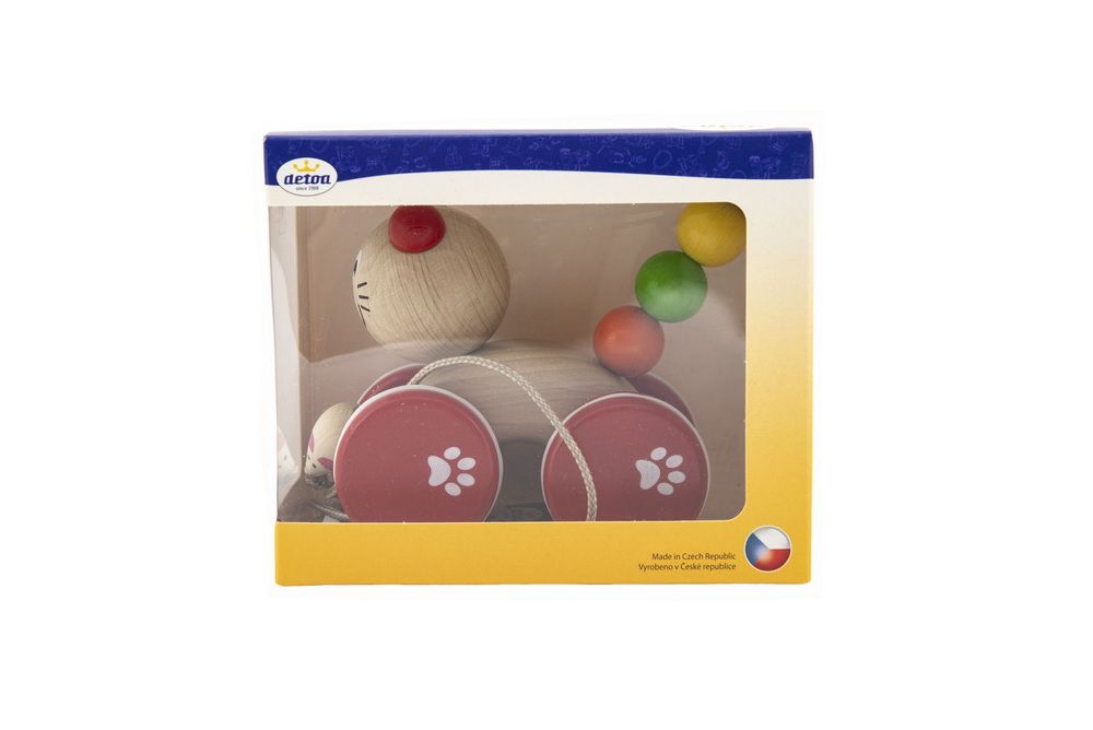 Kočička tahací s myškou dřevo v krabičce 13x11x8cm 12m+