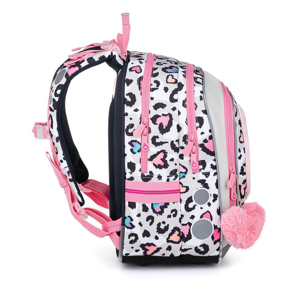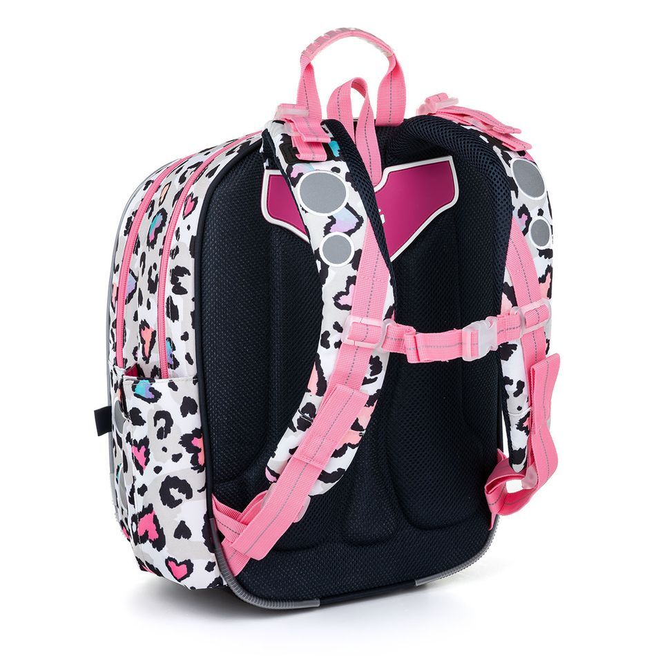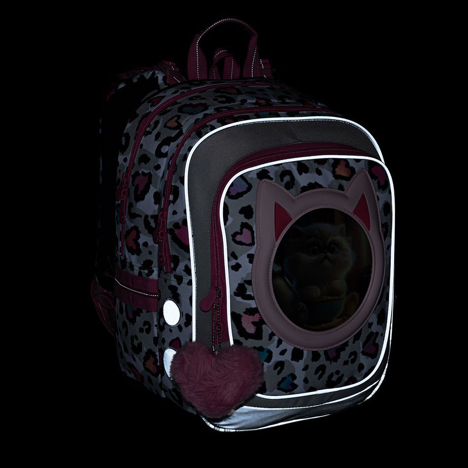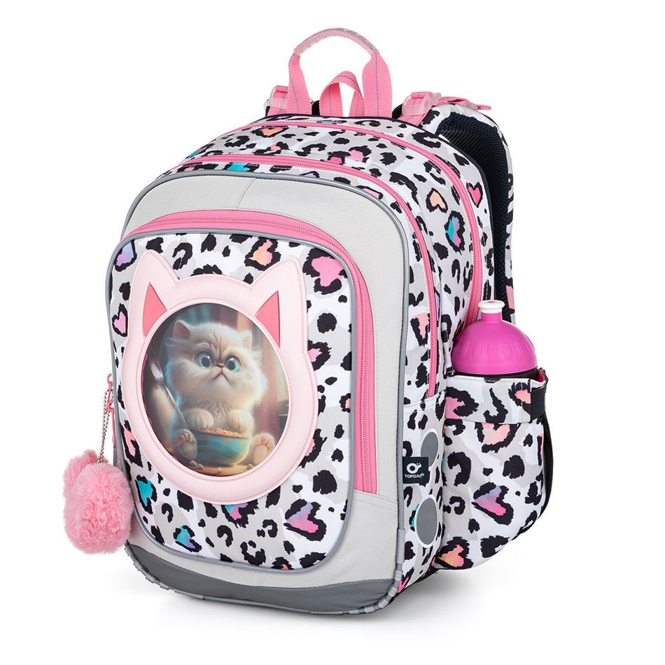 Dvoukomorový batoh s vyměnitelnými obrázky koťátek. Váží 900 gramů a pojme učivo od 1. až 3. třídy. Padne všem dětem od 110 cm výšky.