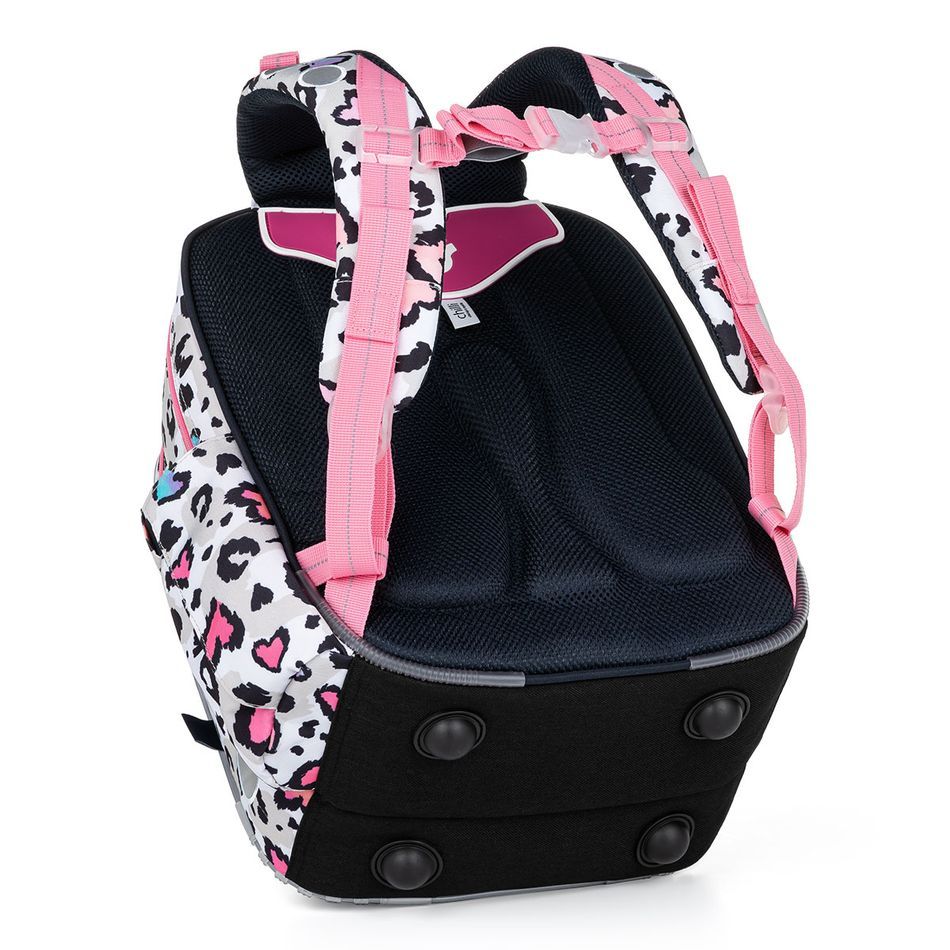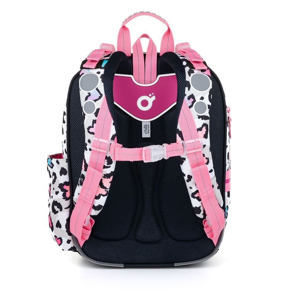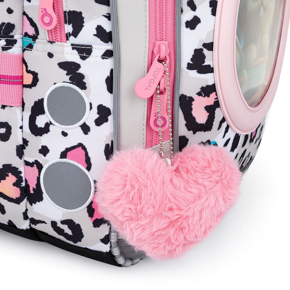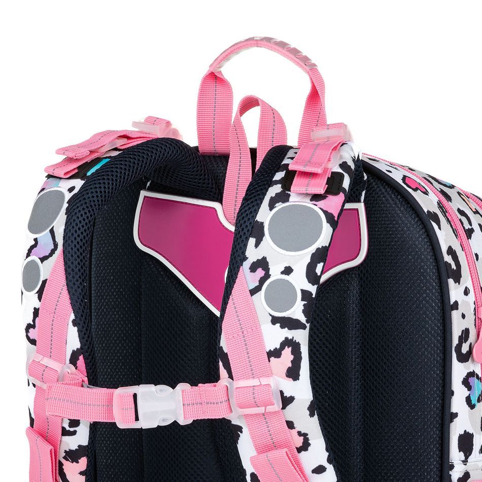 Dvoukomorový batoh s vyměnitelnými obrázky koťátek. Váží 900 gramů a pojme učivo od 1. až 3. třídy. Padne všem dětem od 110 cm výšky.