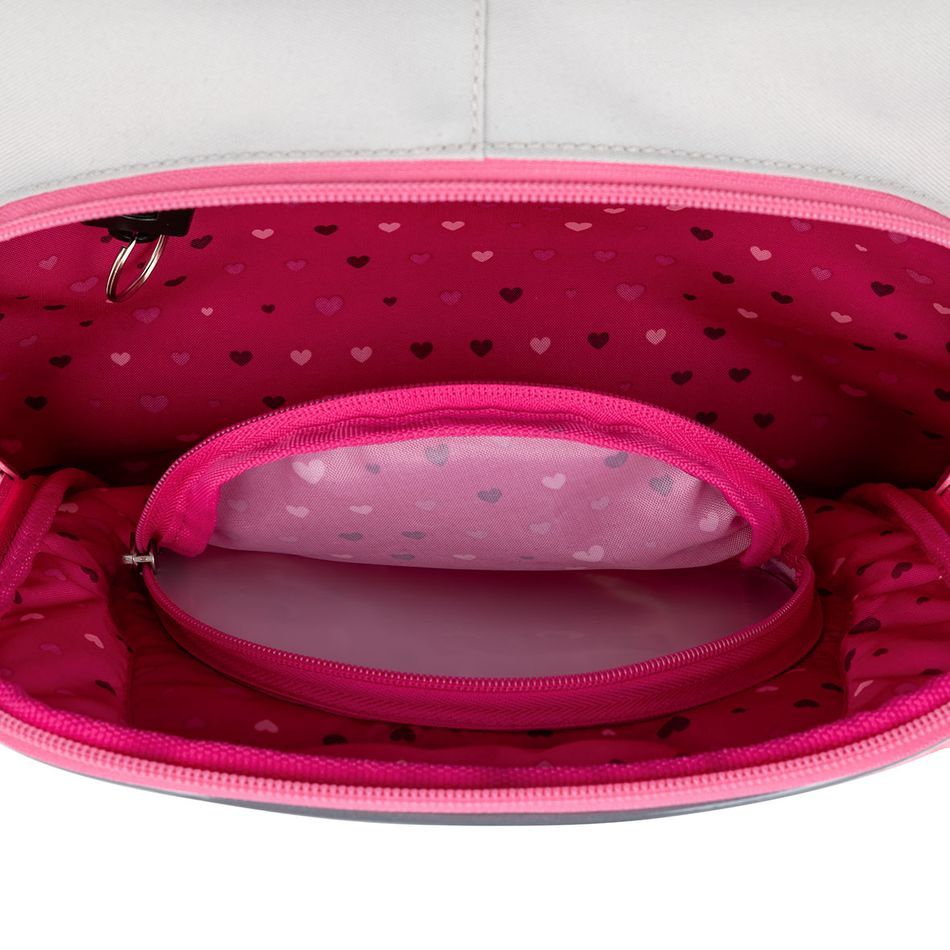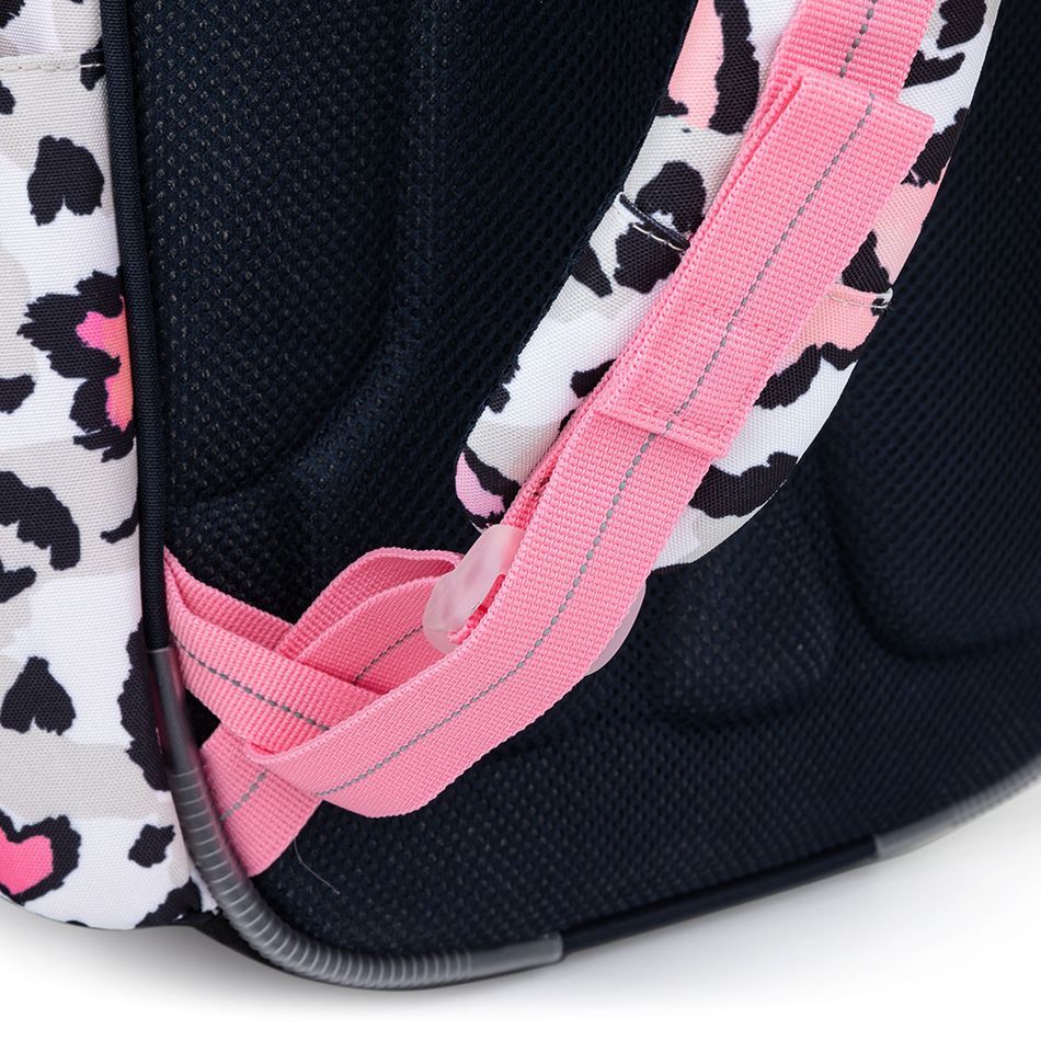 Batoh má dvě objemné hlavní komory. Zadní komora je širší – doporučujeme k zádům dávat nejtěžší učebnice nebo desky na sešity. Přední komora je o něco užší a je v ní umístěna malá síťová kapsa na zip a jmenovka.