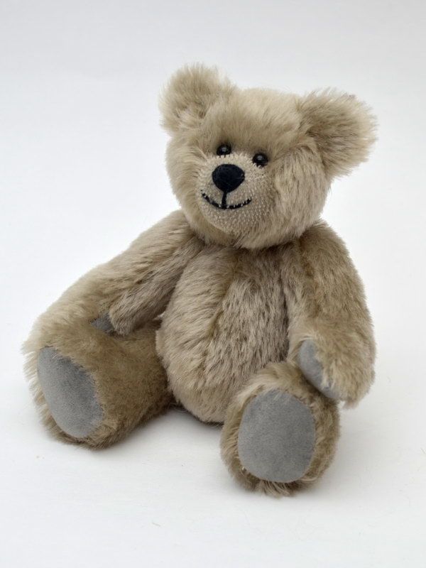 Medvídek s tradiční konstrukcí pohyblivých končetin z pravého mohéru. Limitovaná číslovaná kolekce v dárkové krabičce. Vyrobeno v ČR.