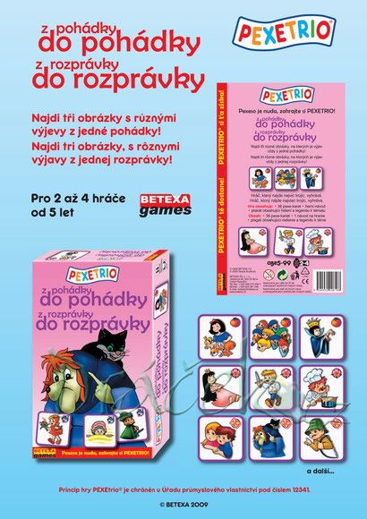 Pexetrio je nová paměťová hra podobná pexesu, rozdíl je v tom, že hledáme trojici obrázků, které k sobě patří, čímž je hra výrazně obtížnější. Aby to nebylo zase tak obtížné, tak jsou kartičky označené identifikačními znaky, podle kterých jednoznačně poznáte, které kartičky patří k sobě.Rozvíjí nejen paměť ale i slovní zásobu a v neposlední řadě vědomosti dětí a v některých případech i vědomosti dospělých. Musím se přiznat, že s některými kombinacemi bych bez identifikačních znaků měla možná problém, ale rozhodně to zvyšuje mojí chuť si hru zahrát s dětmi. Budou se nám i hodit při logopedických cvičeních a jsou výbornou didaktickou pomůckou nejen pro školní zařízení. Trojice jsou tvořeny jednotlivými postavičkami z pohádek a obsahují shodný symbol. Hra obsahuje 36 kartiček. Pro děti od 5 let. Každá hra obsahuje návod a legendu k danému tématu. Recenzi si můžete přečíst ZDE.