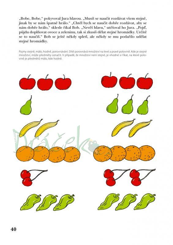 Publikace Počítání soba Boba - 1. díl se vymyká běžným příručkám, které jsou u nás na trhu a zabývají se přípravou na matematiku a především matematickým myšlením. Její zvláštní přínos je v tom, že autorka nenahlíží na matematické dovednosti pouze jako na schopnost počítat, ale zaměřuje se na porozumění matematickým operacím v širokém smyslu toho slova. Dostává se tak i k nám to, co se v některých zahraničních odborných kruzích předpokládá, že rozvoj kognitivních, poznávacích funkcí je předpokladem pro to, abychom předcházeli u žáků obtížím v matematice. Mnohé z těchto dětí se utíkají k bezmyšlenkovitému učení memorováním a pouze reprodukováním toho, co se jim řeklo. Dokonce někteří učitelé se domnívají, že pamětní učení početních příkladů, nejen ve sčítání, ale dokonce i v násobilce, je nejlepší metodou výuky matematiky. V našem prostředí se setkáváme i s názorem, že není nutné, aby se dítě naučilo matematice, může používat kalkulačku. To jsou zcela mylné představy těch, kteří právě proto, že počítat umí, používají tyto nástroje. Zjednodušují si výsledky matematických operací, protože rozumí jejich procesu. Ve skutečnosti by neměl být poznávací přístup v matematice podceněn již v období mateřské školy. To předpokládá, že je dítě dobře seznámeno a přesně používá pojmy, které vymezují prostor, později čas a pořadí. Autorka proto dobře uvádí dítě do jednotlivých pojmů pomocí základní myšlenkové operace - porovnávání. To je základem každé kategorizace, třídění, seskupování podle významu i každého rozhodování. Cílem výuky by měl být rozvoj potřeby spontánního porovnávání u dětí (R. Feuerstein). Proto je nutné vyzbrojit žáky nejen slovní zásobou, jejichž pomocí mohou rozdíly a podobnosti mezi předměty a jevy popsat, ale i přesným vyjadřováním, které jim pomůže porozumět jednotlivým vztahům. Proto bych doporučovala jednotlivé lekce doplnit i pozorováním a porovnáváním předmětů a jevů v nejbližším okolí dítěte, při procházkách, při prohlížení obrázků v knížkách, vždy podle daných měřítek (vyšší - nižší apod.). Rodičům i dětem přeji hezké chvilky strávené nad příběhem a úkoly.