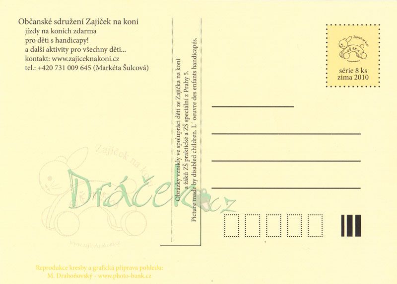 Autor: Lucie, 17 let, autismus. Koupí této pohlednice přispějete na občanské sdružení Zajíček na koni, které pomáhá handikepovaným a znevýhodněným dětem. Celá částka za pohlednici bude věnována tomuto sdružení. Všechny pohledy mají formát klasické pohlednice, jsou na křídovém papíře a s logem sdružení, z něhož je zřejmé, komu jste nákupem pohlednic pomohli.
