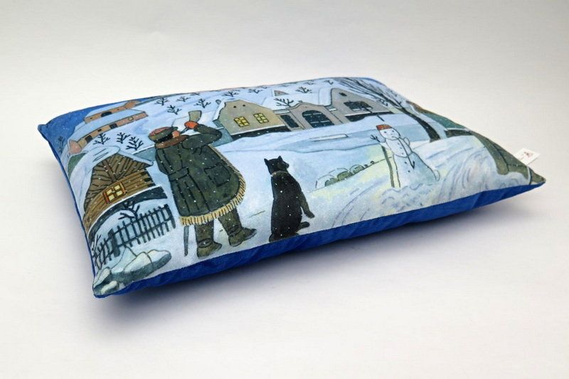 Měkký polštář se zimním motivem Josefa Lady, vhodný na cesty i jako dekorace. Materiál mikrovelur, obrázek tisk, náplň duté vlákno.