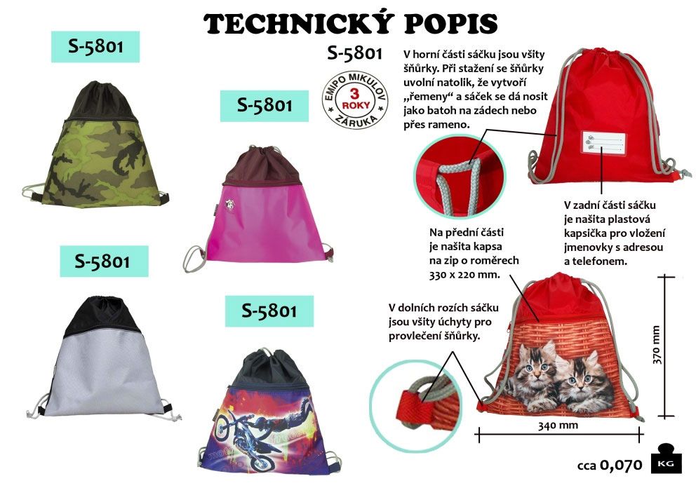 Školní sáček na přezůvky má na celé přední části kapsu na zip. Kapsa má velikost š.330 x v.220mm, celý sáček potom š.340 x v.370mm. Na kapse je barevný celoplošný obrázek. V horní části okraje sáčku jsou navlečeny proti sobě dvě šňůrky jejichž konce jsou zašity v dolních rozích sáčku. Při stažení horní části se šňůky na bocích uvolní natolik, že vytvoří „řemeny“ a sáček se dá nosit jako batoh na zádech. Váží cca 0,07kg. Sáček je vhodný pro žáky 1.stupně ZŠ.
