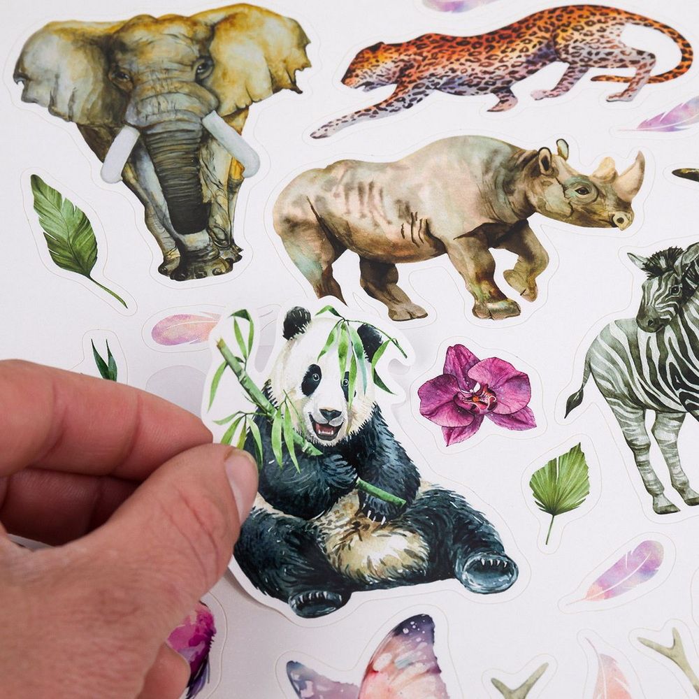 Samolepky s ikonickým motivem exotických i lesních zvířátek na kufříky a složky na sešity Topgal.
