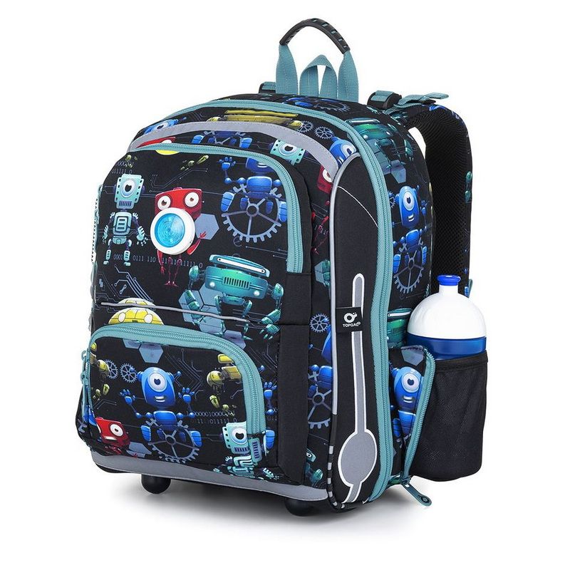 Černá aktovka s roboty a blikačkou pro nejdrobnější chlapečky. Vhodná do první až druhé třídy základních škol.