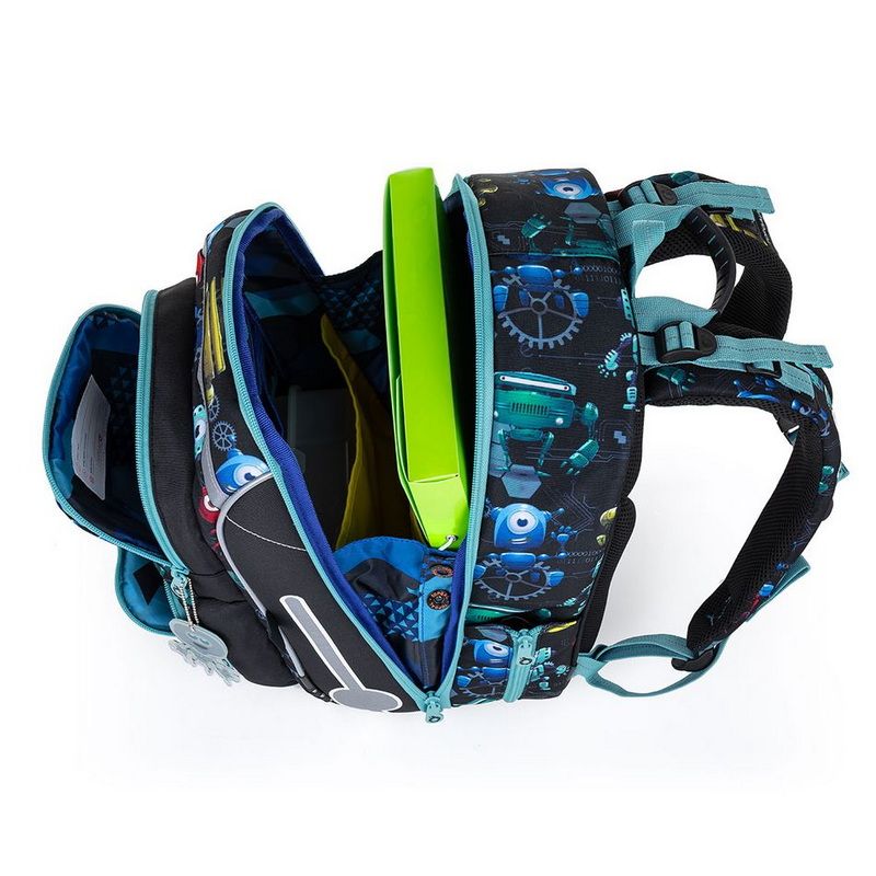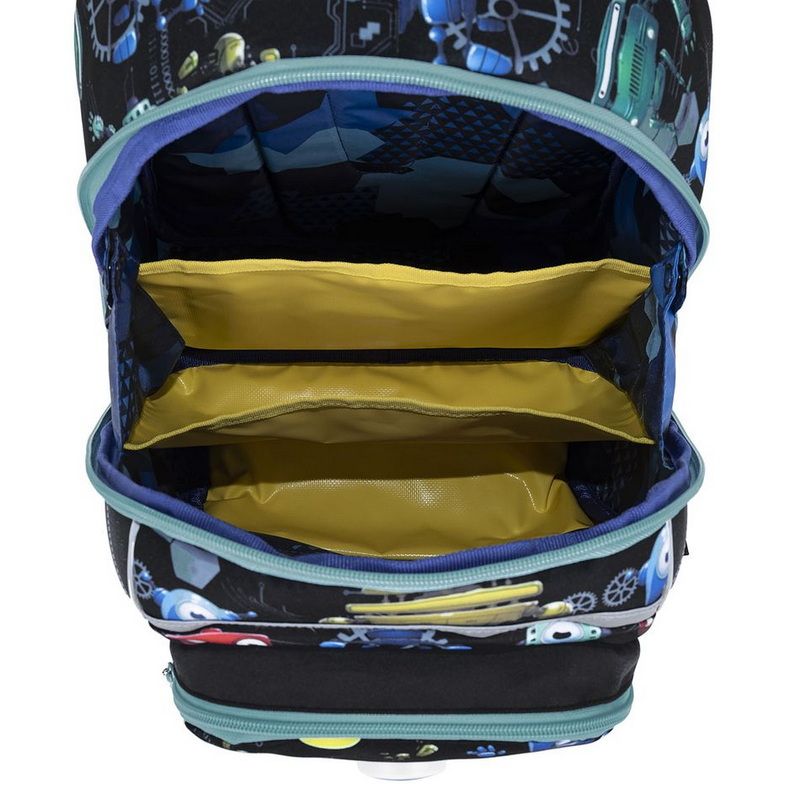 Batoh má jednu velkou komoru se žlutým nepropustným organizérem. Na přední části aktovky najdete další dvě praktické kapsy na zip s blikačkou. Ve vnitřní kapse jmenovku.