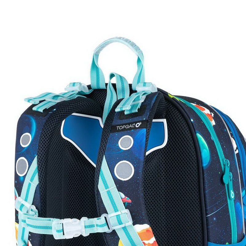 Záda batohu jsou tvořena z lehké tvarované pěny. Díky ergonomicky tvarovaným polstrovaným popruhům bude batoh pohodlně nosit i těžký náklad. Popruhy na záda školáčkovi nejdříve utáhněte ve spodní části na délku tak, aby batoh seděl na kosti křížové.