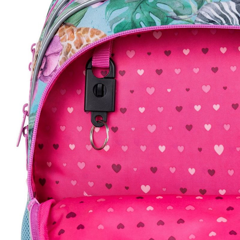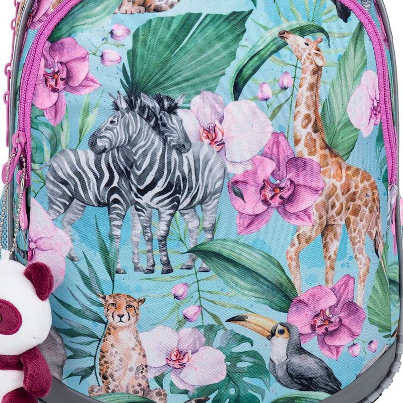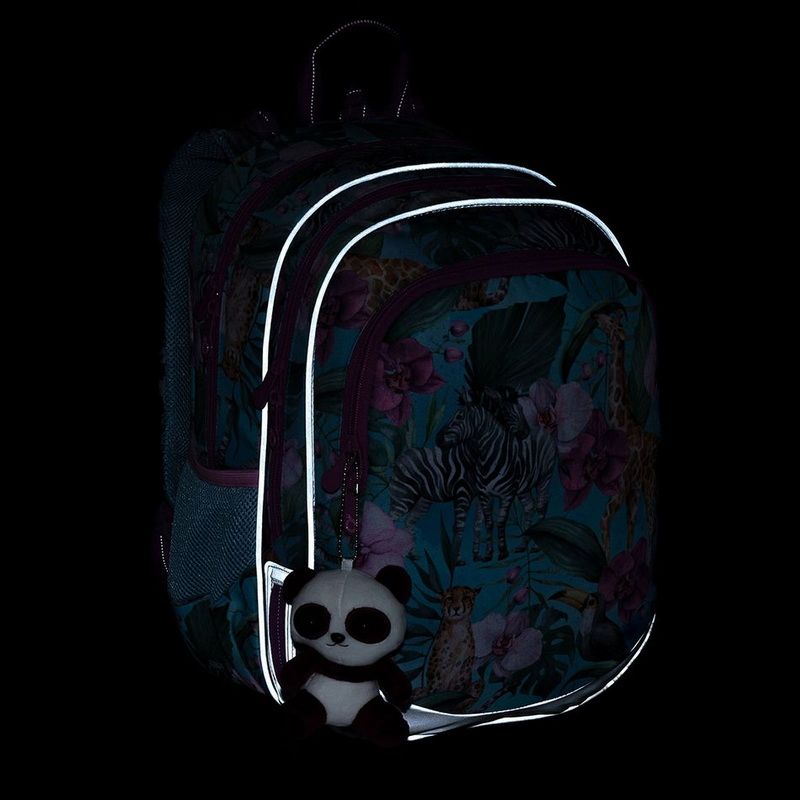 Tyrkysový batoh s růžovými zipy, se zvířátky ze Safari a plyšovou pandou jako přívěskem.