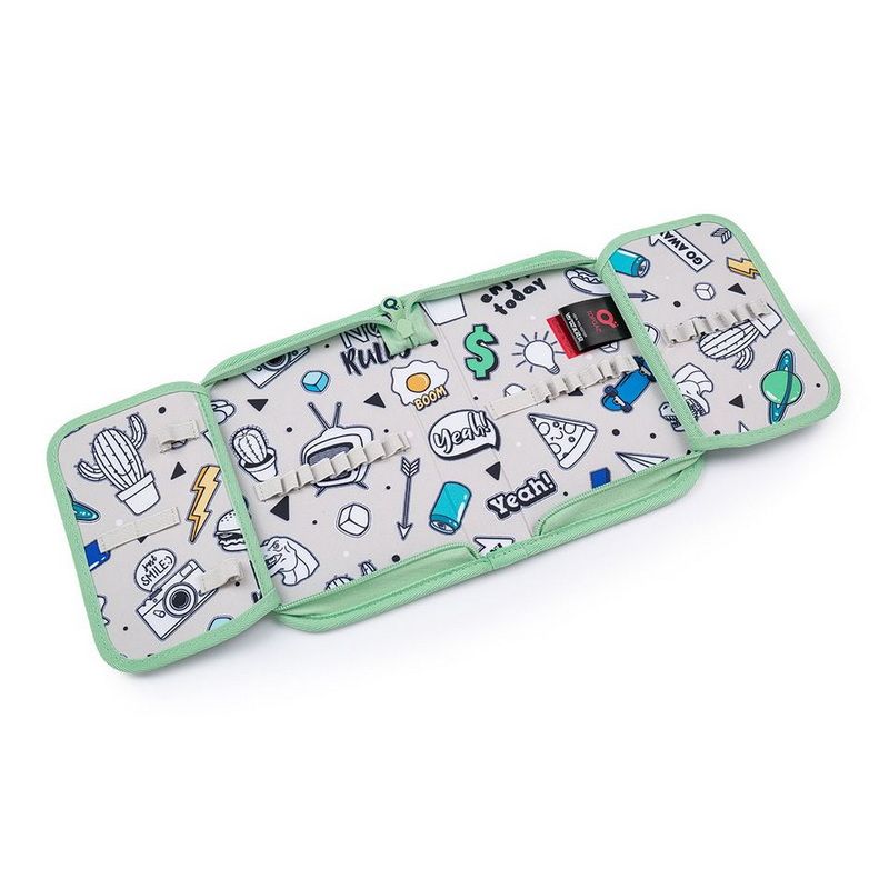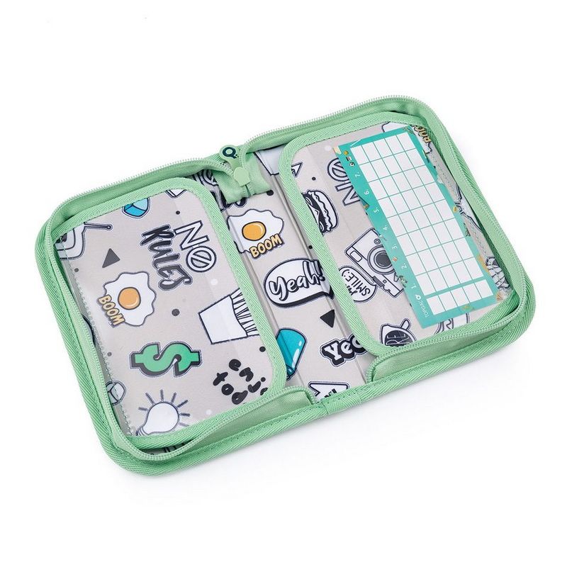 Jednopatrové školní pouzdro se dvěma klopnami je vybaveno 21 klasickými gumovými úchyty na pastelky a fixy, třema širšími úchyty na pravítko, kružítko či nůžky a dvěma většími úchyty na gumu a ořezávátko. Pod klopou z průhledné folie najdete rozvrh hodin, druhé poslouží třeba i na taháky :-)