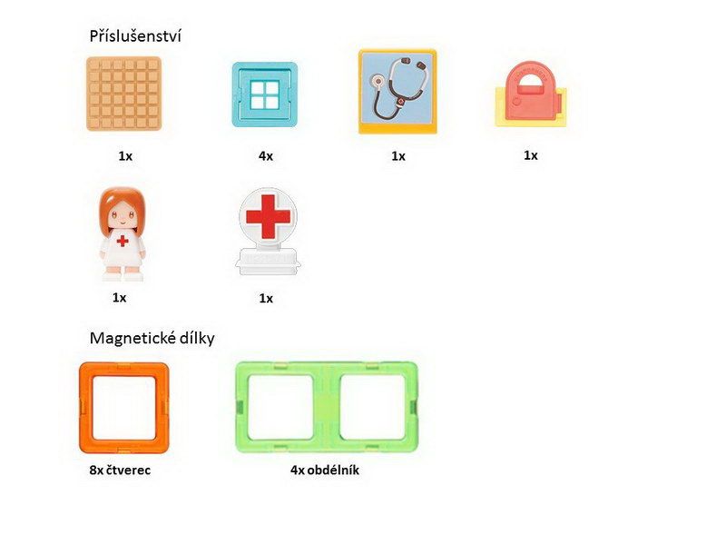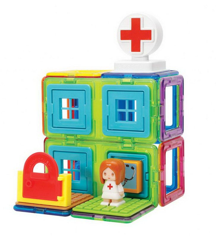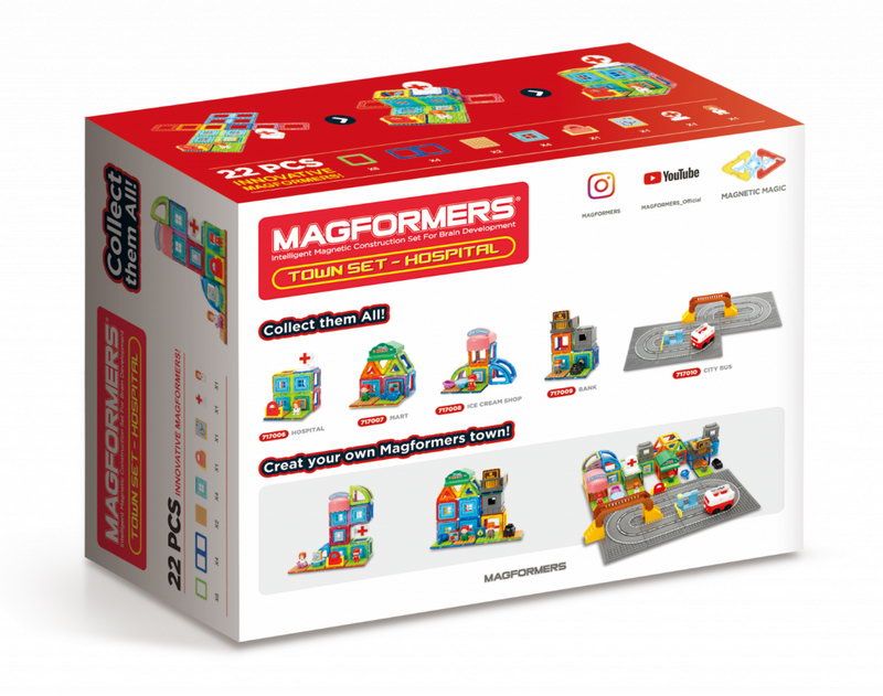 Obsahuje 12 magnetických tvarů a 9 funkčních doplňků vč. malé lékařky. Lze sestavovat různě architektonicky řešené tvary nemocnice dle vlastní fantazie. Přidáním dalších dílků Magformers získá vaše nemocnice na velikosti a různorodosti. Výsledné stavby mají formu poloodkrytého průřezu, kde jsou z jedné strany patrné vnější kontury stavby a z druhé interiérové řešení, které můžete postupně obměňovat.