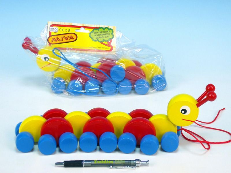 Tahací housenka barevná pro nejmenší děti je vyrobena z přírodního dřeva. Dřevěné hračky mají větší výdrž a je to příjemný materiál pro děti. Housenka se při jízdě pohybuje.