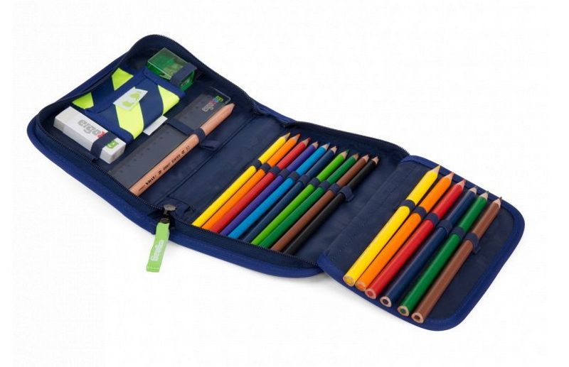 Penál Ergobag je plně vybavený, jednopatrový penál s chlopní a prostorem na rozvrh hodin. Součástí dvacetidílného setu jsou trojhranné pastelky a tužky produktové řady Lyra. Jejich speciální trojhranný tvar napomáhá správnému uchopení. Vnitřek penálu je tmavě modrý.